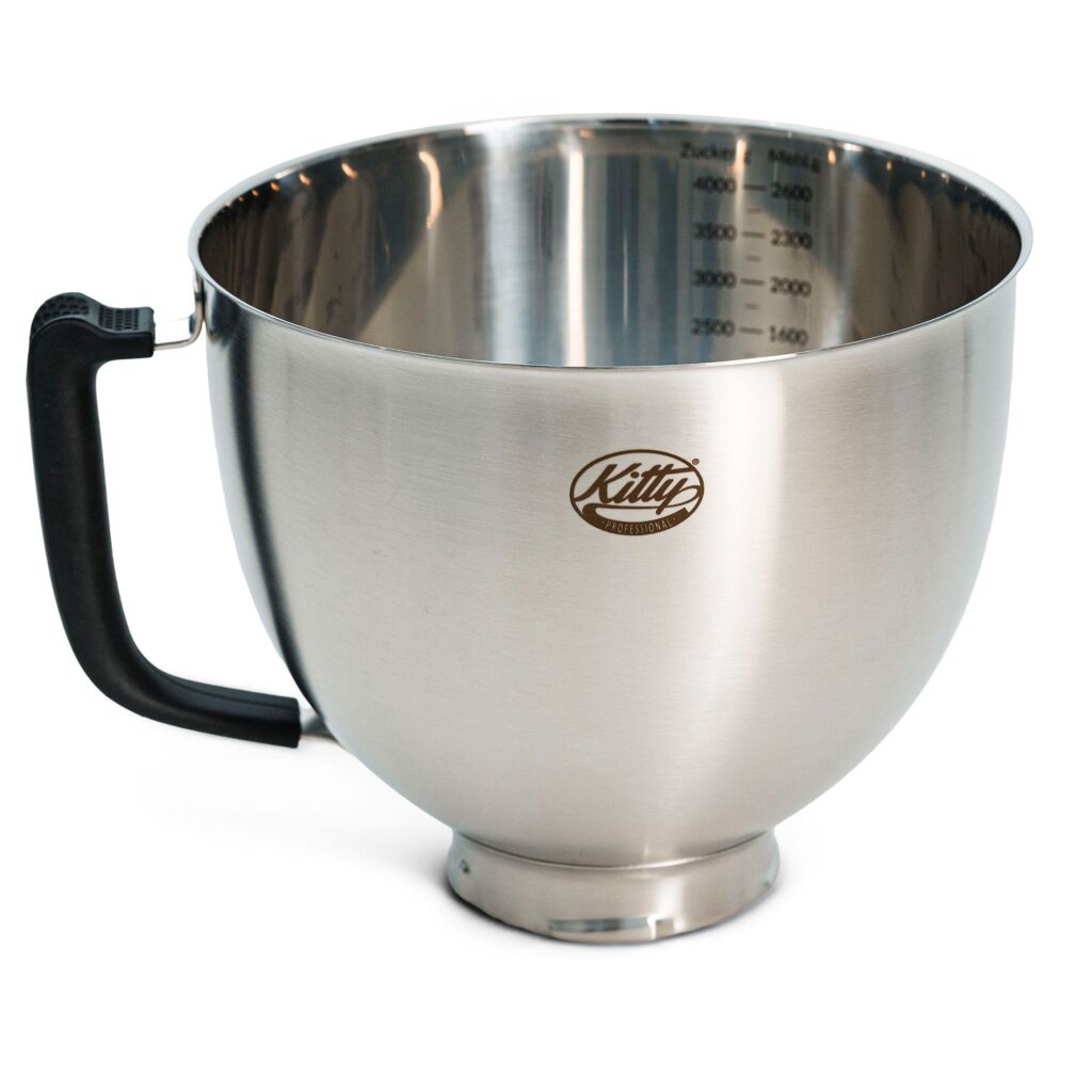 Die Kitty Professional Super Bowl wurde von deutschen Ingenieuren speziell für die Anforderungen von KitchenAid-Nutzern entwickelt. Sie besteht aus massivem 18/10 Edelstahl – das sorgt für maximale Hygiene, Stabilität und Langlebigkeit. Dank der integrierten Füllskala und des ergonomischen Silikongriffs hast du jederzeit volle Kontrolle und sicheren Halt, selbst bei schweren Teigmassen oder heißen Zutaten.