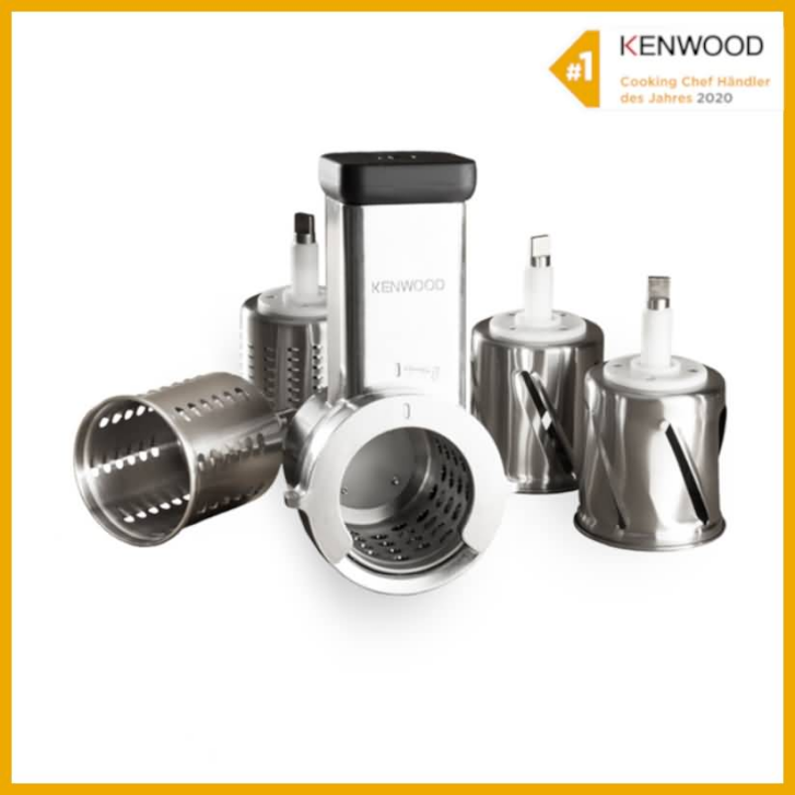 Die Kenwood Trommelraffel KAX643ME gehört zu den meistverkauften Zubehören für Kenwood Küchenmaschinen, ist dieses Zubehör doch ein richtiges Universalgenie. Ihre robuste Ausführung genügt professionellen Ansprüchen und ihre Vielseitigkeit wird dem Einsatz in jeder Küche gerecht. Die große Anzahl von Schneidtrommeln aus dem Lieferumfang der Kenwood Trommelraffel bietet für viele Aufgaben das richtige Werkzeug. Die Trommelraffel kommt mit 5 verschiedenen Einsatztrommeln, damit kannst Du schneiden, raffeln reiben und noch vieles mehr. Du kannst sie ganz einfach am Kraftanschluss anschließen. Zu den 5 verschiedenen Einsatztrommeln: Grobes Reiben, feines Reiben, dicke Scheiben, dünne Scheiben, sowie eine Kronenreibe zur perfekten Herstellung von Reibekuchen. Die hochwertige Metall-Ausführung der Trommelraffel ist auch perfekt für Dauerbetriebe geeignet. Wie alle Zubehöre aus Metall, solltest Du sie per Hand waschen.