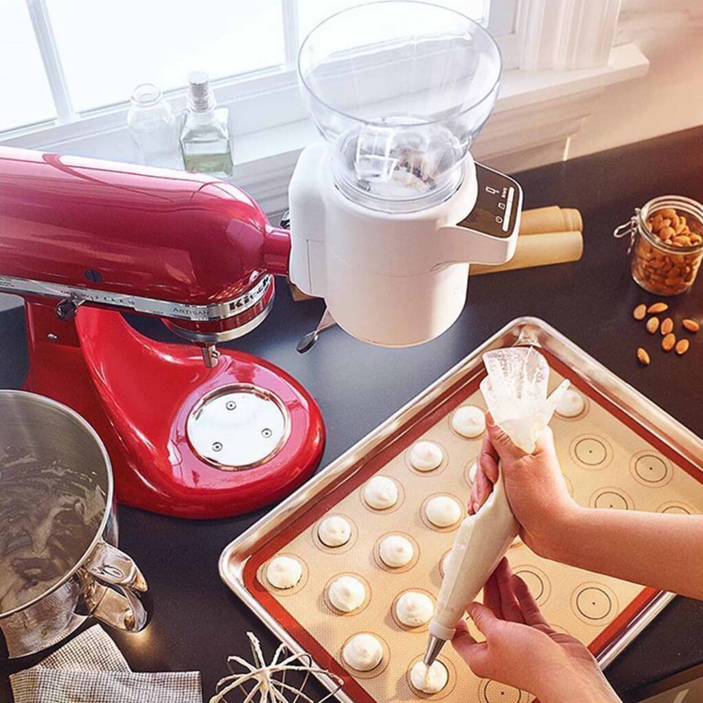 Dieser hält die Küche sauber und erleichtert das Einfüllen in die Rührschüssel durch die eingebaute Einfüllschütte