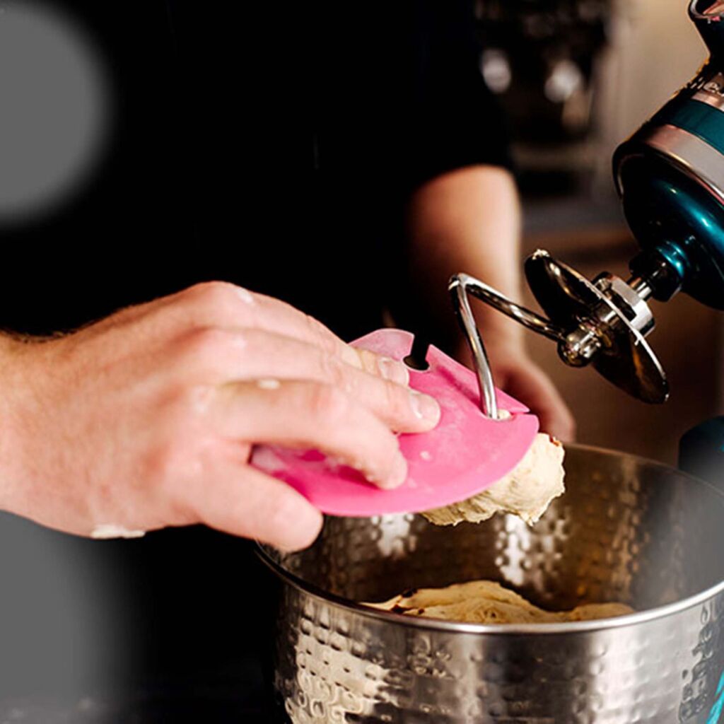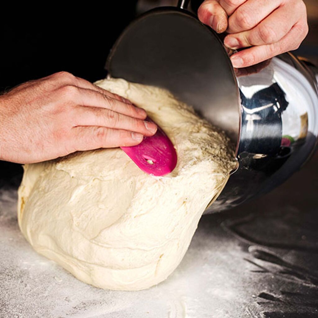 Die Teigkarte kann nach dem Arbeiten beim Reinigen unterstützen. Dank robustem Edelstahlkern und flexiblem Hochleistung-Silikon holt sie Teigreste aus der Schüssel und wischt Mehl & Teig mühelos von der Arbeitsfläche – für weniger Aufwand und mehr Sauberkeit.