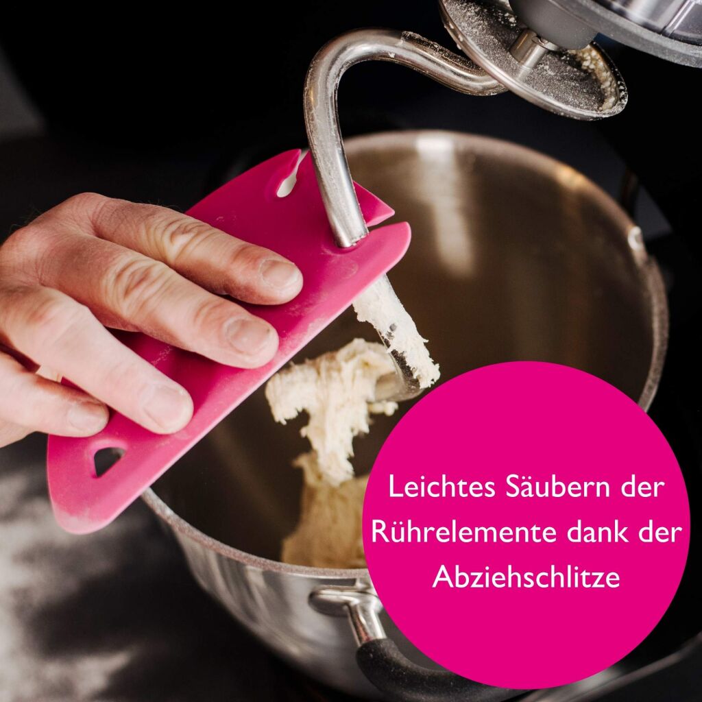 • Die schmale Einkerbung: ideal zum Abstreifen von Teigresten an kleinen bis mittleren Rührelementen, die große für kräftige Knethaken.