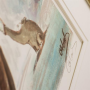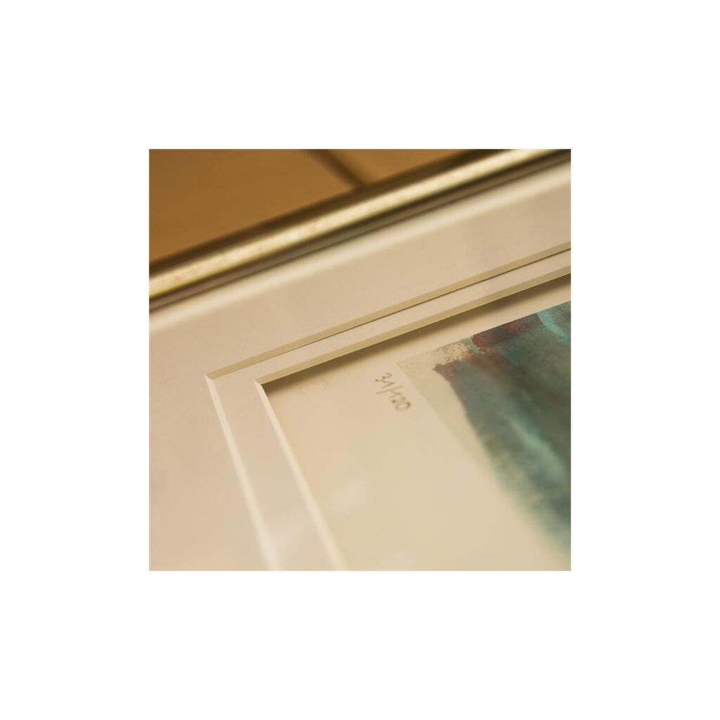 Die Lithografie ist umrandet von einem Doppel-Passepartout und befindet sich in einem – rückseitig verklebten - hochwertigen silberfarbenen Holzrahmen.