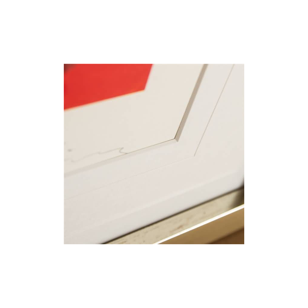 Die Lithografie ist umrandet von einem Passepartout und befindet sich in einem – rückseitig verklebten - hochwertigen silberfarbenen Holzrahmen.