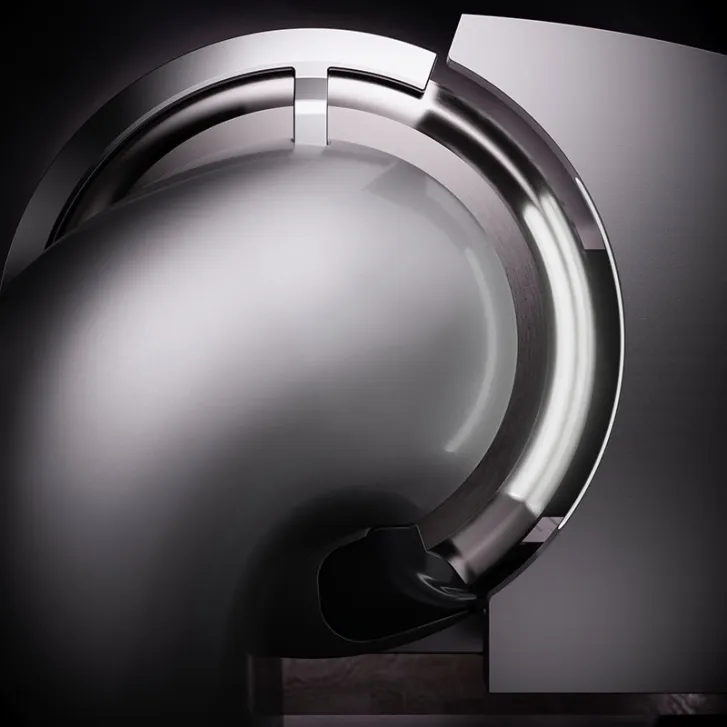 Die hohlgeschliffene, geschmiedete Messerscheibe aus Edelstahl schneidet mit seiner glatten Schneide in Verbindung mit der hervorragend gleitenden Edelstahl-Abdeckung Deine Lebensmittel ganz besonders schonend und gleichmäßig auf.