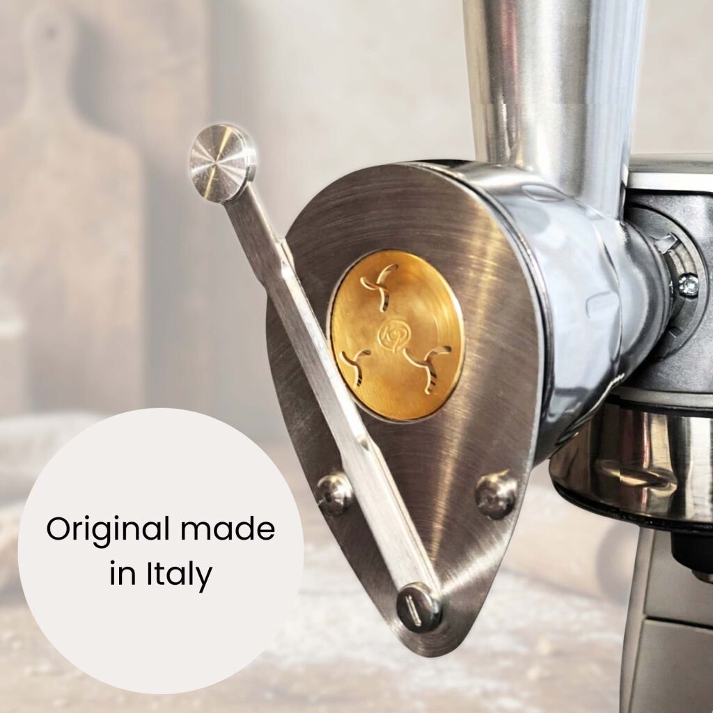 Die Matrize besteht aus traditioneller Bronze (Messing), dem klassischen Material der Pastahersteller. Aber warum Bronze? Weil sie der Pasta eine leicht raue Oberfläche verleiht - ideal, damit Saucen besonders gut haften. Gleichzeitig ist das Material robust und langlebig, für zuverlässige Ergebnisse selbst bei regelmäßigem Einsatz.