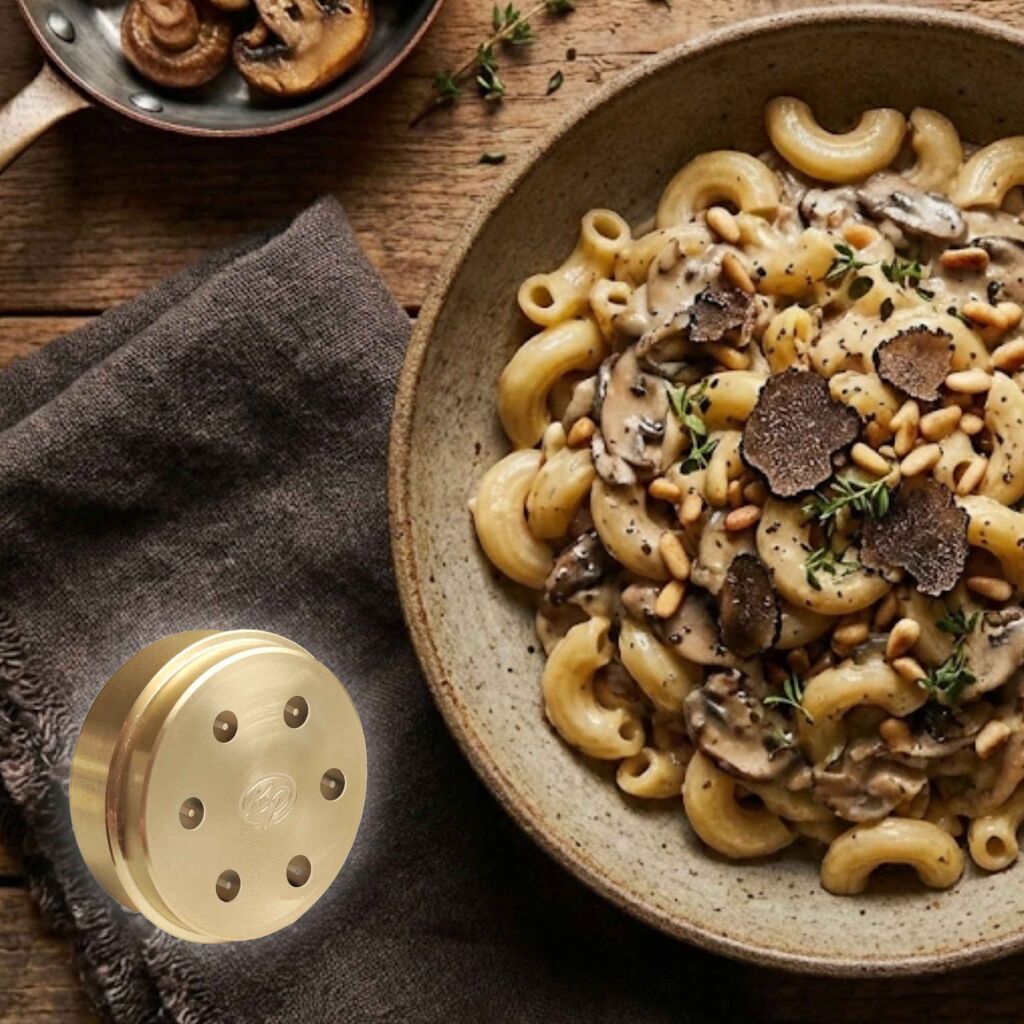 Die Matrize besteht aus traditioneller Bronze (Messing), dem klassischen Material der Pastahersteller. Aber warum Bronze? Weil sie der Pasta eine leicht raue Oberfläche verleiht - ideal, damit Saucen besonders gut haften. Gleichzeitig ist das Material robust und langlebig, für zuverlässige Ergebnisse selbst bei regelmäßigem Einsatz.