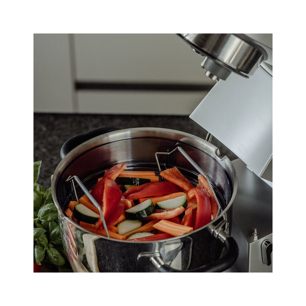 Die Grundausstattung dieser exklusiven Küchenmaschine ist sagenhaft. 5 verschiedene Rührelemente für die verschiedensten Teige und Mixturen verarbeiten Deine Zutaten schnell und gründlich. Ob schwerer Hefeteig oder eine leichte Dessertcreme: Alles gelingt schnell und perfekt. Die hochglanzpolierte Koch- und Rührschüssel aus dickem Edelstahl kommt mit praktischer Innenskalierung, wärmeisolierenden, rutschfesten Griffen und Ausguss. Ein Dampfgarsieb zum schonenden Dämpfen von Fleisch, Obst und Gemüse ergänzt den Lieferumfang sinnvoll und durchdacht.