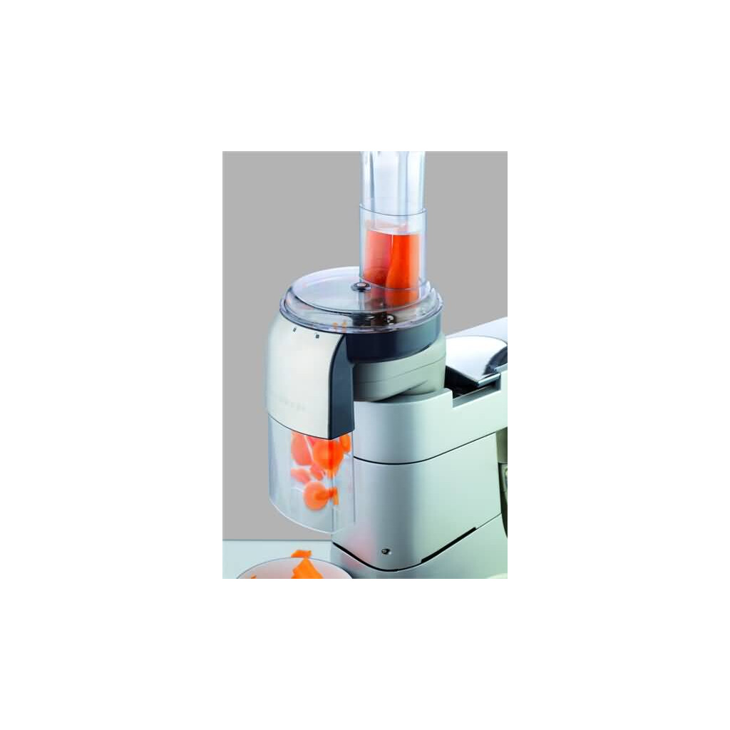 Dieses Schnitzelwerk mit seinen 7 verschiedenen Messerscheiben wird am Hochgeschwindigkeitsanschluss auf der Oberseite der Küchenmaschine angeschlossen. Der Auswurf erfolgt direkt in die untergestellte Schüssel. Damit ist dieses Zubehör für alle interessant, die große Mengen Obst und Gemüse verarbeiten. Die 7 Messer bieten folgende Funktionen: