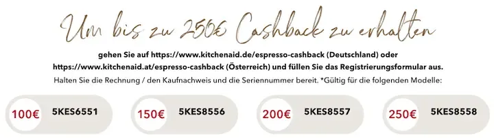 2. Vorlegung des Kaufbeleges über https://www.kitchenaid.de/espresso-cashback bis spätestens 31.01.2026 um Mitternacht.
