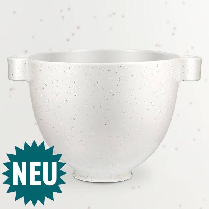 Wow! Man beachte die zwei vollkommen neuen Griffe an der Keramikschüssel Speckled Stone von KitchenAid. Denn zwei Griffe sind nicht nur ungemein praktisch, weil sie das Tragen erleichtern, wenn die Rührschüssel mal wieder richtig voll ist, sondern: Sieht das in Verbindung mit der dezent gesprenkelten Lasierung in gebrochenem Weiß nicht auch richtig schön aus? Wir haben uns sofort in diese KitchenAid Keramikschüssel Speckled Stone verliebt! Ihr knuffiger Auftritt passt perfekt zu einer Artisan Küchenmaschine. Und das extrem zurückhaltende, aber trotzdem fröhliche Muster der Speckled Stone macht einfach nur Freude.