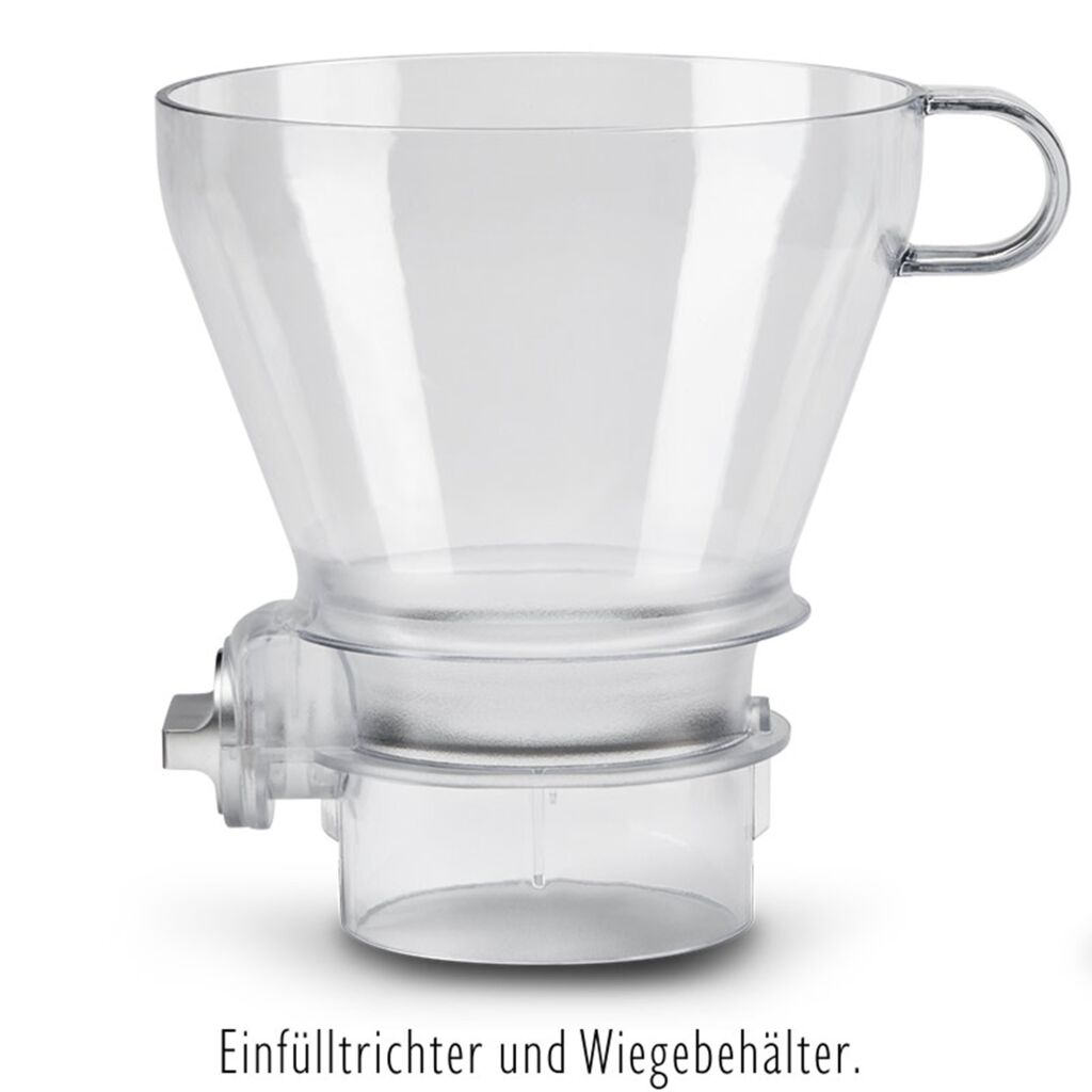 Zum Entnehmen löst du die Verriegelung und nimmst das Sieb nach oben heraus. So kannst du entweder sieben oder die Zutaten über die Waage wiegen und sie über die Edelstahl-Schütte in die Schüssel geben.