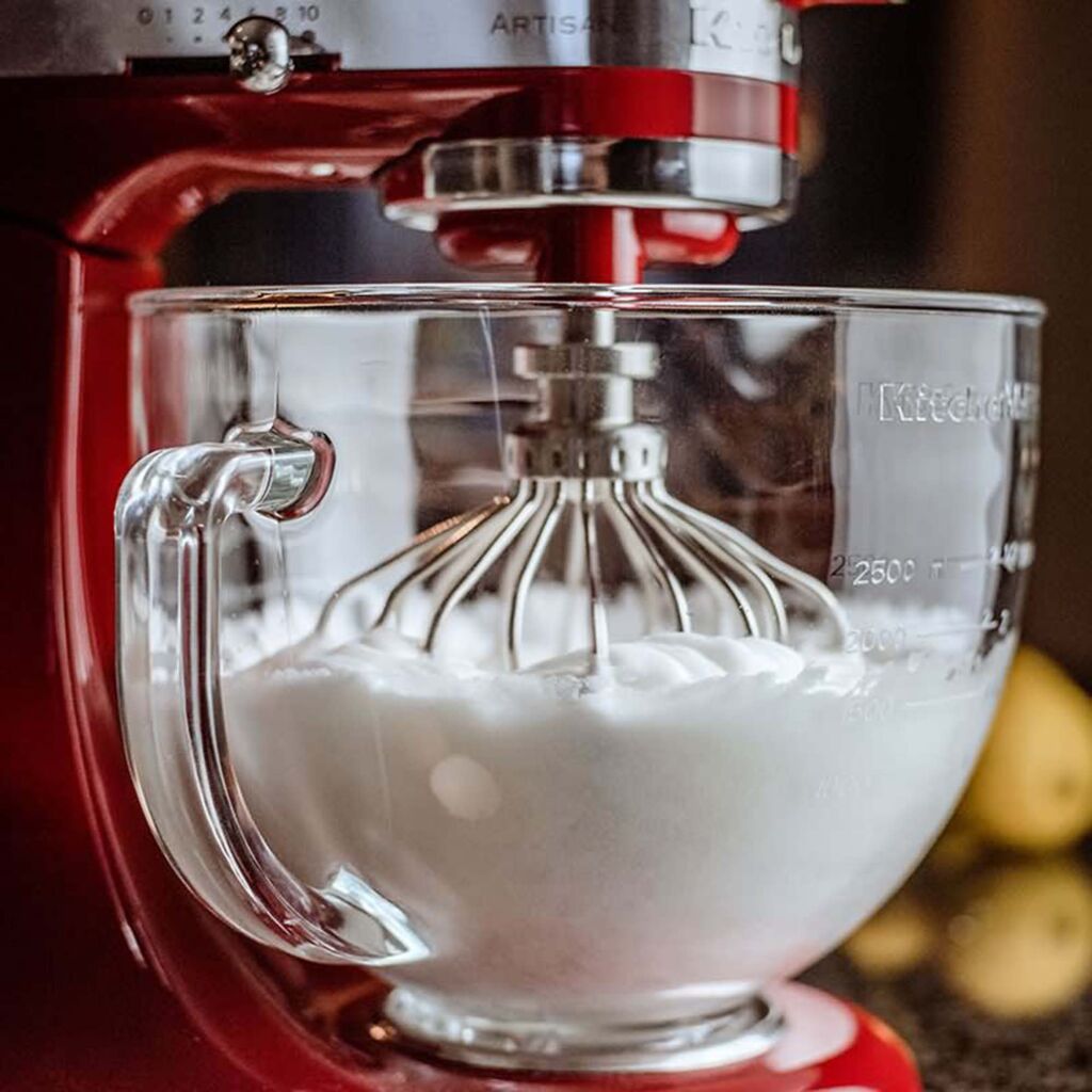 Er ist kompatibel mit allen KitchenAid-Küchenmaschinen mit 4,3 L, 4,7 L oder 4,8 L Schüssel und eignet sich perfekt für Sahne, Eischnee, weiche Butter oder flüssige Teige wie Waffeln und Crêpes.