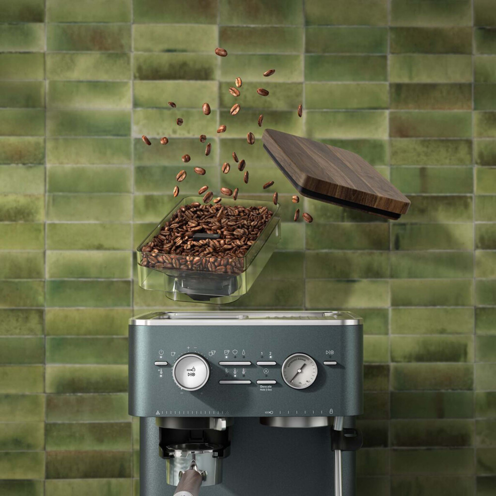 - Materialien: Edelstahl (Portafilter & Tamper), Kunststoff (Bohnenbehälter), echtes Walnussholz (Griffe & Deckel).